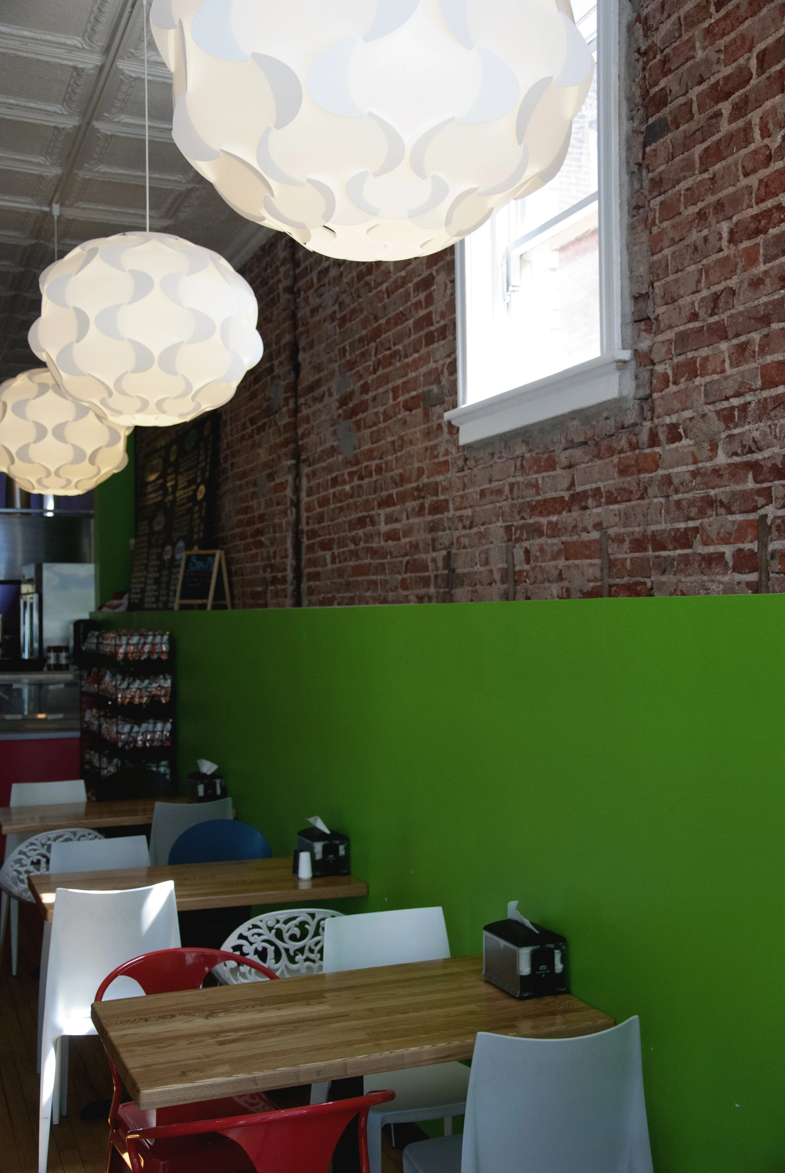 Most of the interior finishes were peeled away to expose the simple elements that make up many buildings in St. Louis; brick, wood floor and metal ceilings. New HVAC and lighting complemented the eclectic, contemporary furniture and retail counter. In an effort to connect patrons with the pedestrian traffic, window seating was incorporated in the design along with sidewalk seating. Overall, the space is a welcoming space that has proven to be a successful complement to an outstanding local eatery. AD:ARCH provided design and construction management services.